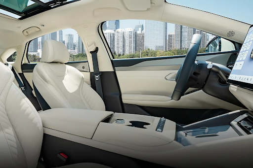 Салон BYD Qin L сочетает современные технологии с элегантным дизайном. Он оснащен плавающей центральной консолью с узкими вентиляционными отверстиями, трехспицевым рулем со скошенной нижней частью и цифровой приборной панелью. Дверные карты отделаны серебристыми вставками, подчеркивая внимание к деталям. -
